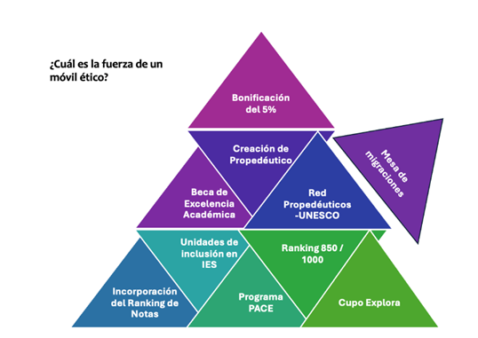 Con el compromiso de enfrentar el desafío de “no dejar a nadie atrás” (UNESCO, 2022) y aportar a los Objetivos de Desarrollo Sostenible (ODS), y en particular con ODS 4: Educación de calidad, inclusiva y equitativa, hemos trabajado junto a un equipo de personas de distintas instituciones de educación superior como la Universidad de O’Higgins, Universidad Católica de Temuco, Universidad Católica del Norte, Pontificia Universidad Católica de Valparaíso, entre muchas otras de una extensa lista. Gracias esta valiosa red se ha podido ampliar y potenciar diferentes iniciativas a lo largo del país como el Propedéutico, Programa de Acompañamiento y Acceso Efectivo a la Educación Superior PACE, Ranking 850/1000, Cupo Explora, por nombrar algunas.